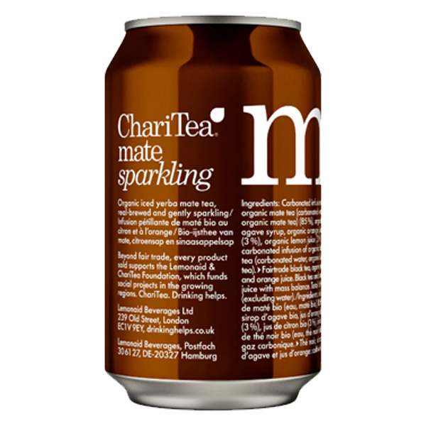 Carbonated infusion of organic mate tea (carbonated water, organic mate tea) (85 %), organic agave syrup, organic orange juice (3 %), organic lemon juice (3 %), carbonated infusion of organic black tea (carbonated water, organic black tea). Fairtrade black tea, agave syrup and orange juice. Black tea and orange juice with mass balance. Total 66 % (excluding water).
