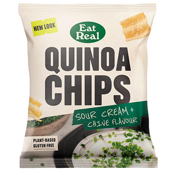 Eat Real Quinoa Chips Sour Cream & Chive 90g - Quinoa based chips with sour cream & chive flavour seasoning. Eat Real Quinoa Chips are packed with flavour and crunch. Plant-based, gluten-free. They're great for grazing while you cook dinner, or with a dip.