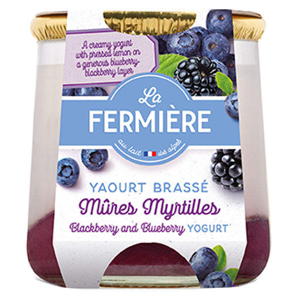 This yogurt associates the creaminess of an authentic stirred yogurt made with good milk from the Alpes, and the intensity of a blackberry and blueberry layer.