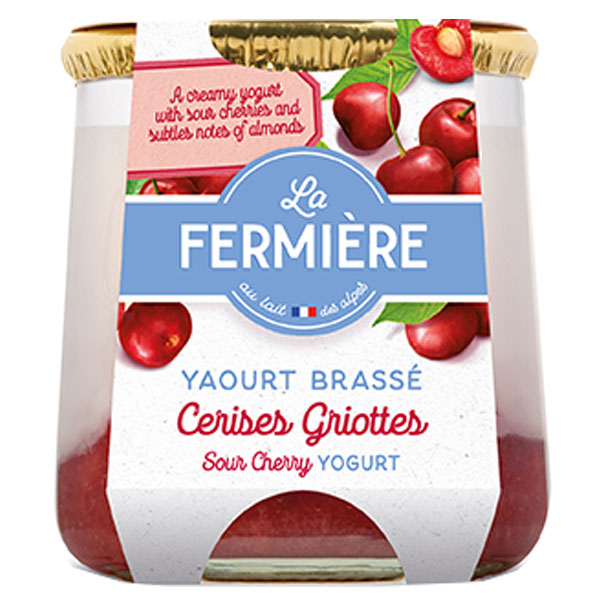 This yogurt associates the creaminess of an authentic stirred yogurt made with good milk from the Alps, and the smoothness of a hint of almond milk, on a generous cherry layer.
