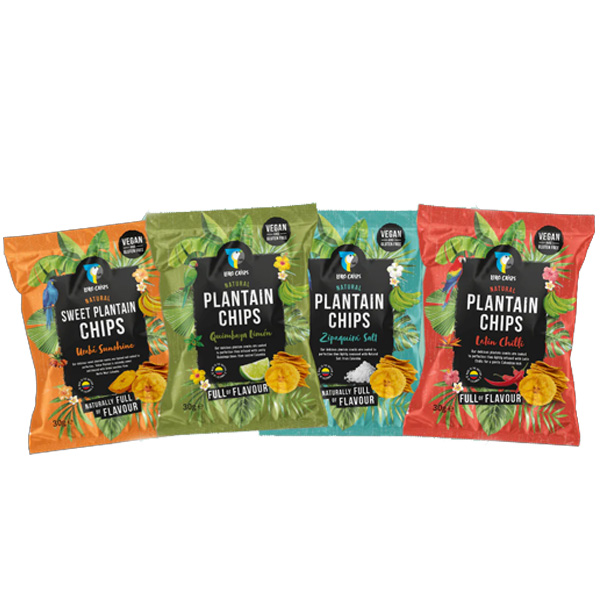 Salt: Green plantain, non-hydrogenated palm oil, salt. Lime: Green Plantain, Non-hydrogenated VegetableM Oil (Palm Olein), Lime Flavor (Maltodextrin,Salt, Acidulants (Citric Acid, Malic Acid, Ascorbic Acid), Sugar, Yeast Extract, Natural Lime Flavor And Anti-Caking (Silicon Dioxide)). Chilli: Green plantain, non-hydrogenated palm olein, chilli flavour (Corn starch, dispersion carrier (dextrose), salt, sugar, chili powder, oleoresin capsicum. Sweet: Ripe plantain, non-hydrogenated palm olein.
