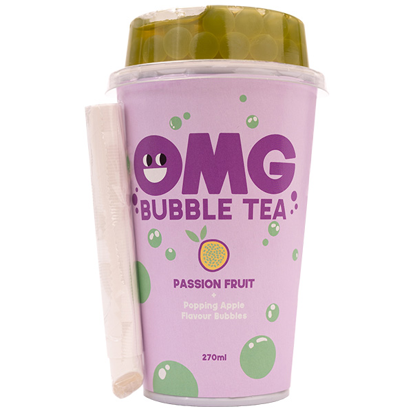 Ingredients list: soft drink (water, sugar, acidity regulator: citric acid, passion fruit flavour green tea extract 0,05 %, flavouring, apple flavor bubbles (water, fructose, green apple juice (2,6 %), starch, acidity regulator (citric acid, calcium lactate), acid: citric acid, gelling agent: sodium alginate, green apple flavouring, antioxidant: ascorbic acid, colour: copper complexes of chlorophylls and chlorophyllin; preservative: potassium sorbate).