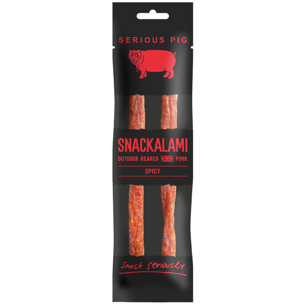 Two sticks of SPICY, MEATY and SERIOUSLY DELICIOUS snacking SALAMI, made with Outdoor Reared BRITISH PORK.