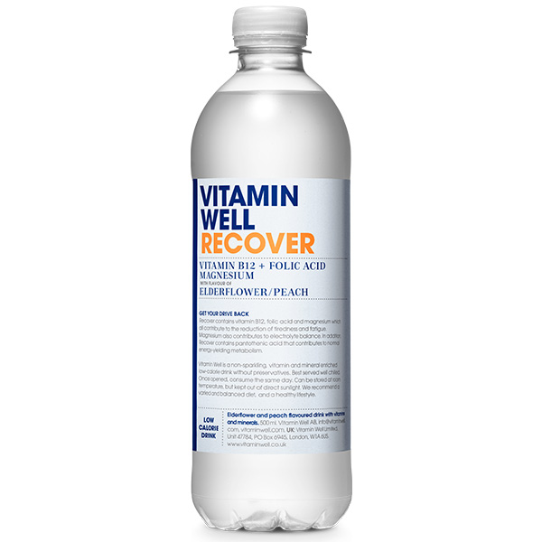 Recover contains vitamin B12, folic acid and magnesium which all contribute to the reduction of tiredness and fatigue. Magnesium also contributes to electrolyte balance. In addition, Recover contains pantothenic acid that contributes to normal energy-yielding metabolism. Vitamin Well is a non-sparkling, vitamin and mineral enriched low-calorie drink without preservatives.